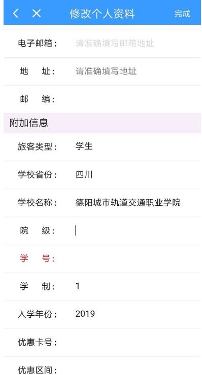 3、找到【附加信息】选项,点击右上角【修改】,在学生类型中选择【学生】,然后按要求添加学校省份、学校名称、院级、学号、优惠区间(优惠区间要写学生证上填写的优惠区间)等信息即可。