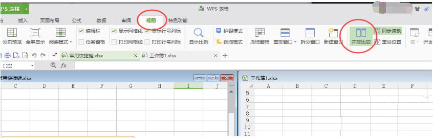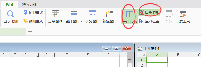 1、打开需要的表格(可以同一窗口2个工作簿,也可以是两个独立的窗口),选中“视图-并排比较”如下图,可以看到工作簿1 和工作簿2 是并排显示的,主要用于对比。