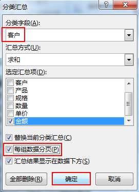 2、【数据】→【分类汇总】→【分类字段:客户】→勾选【每组数据分页】复选框→【确定】。