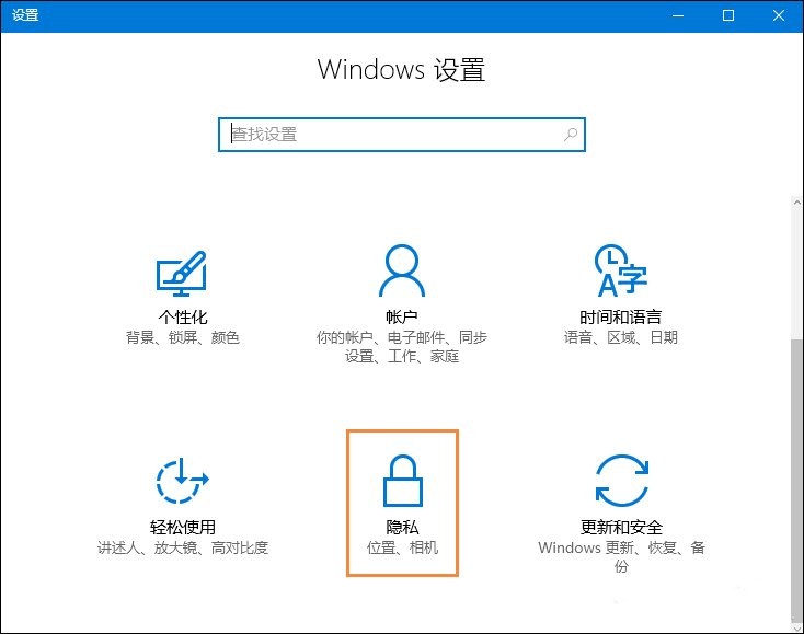 2、在弹出的“设置”窗口中点击“隐私(位置 相机)”。
