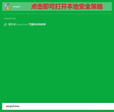 点击打开Win10开始菜单,在搜索框中输入“secpol.msc”,上面出现的搜索结果中,点击第一个项目,即可打开“本地安全策略”。