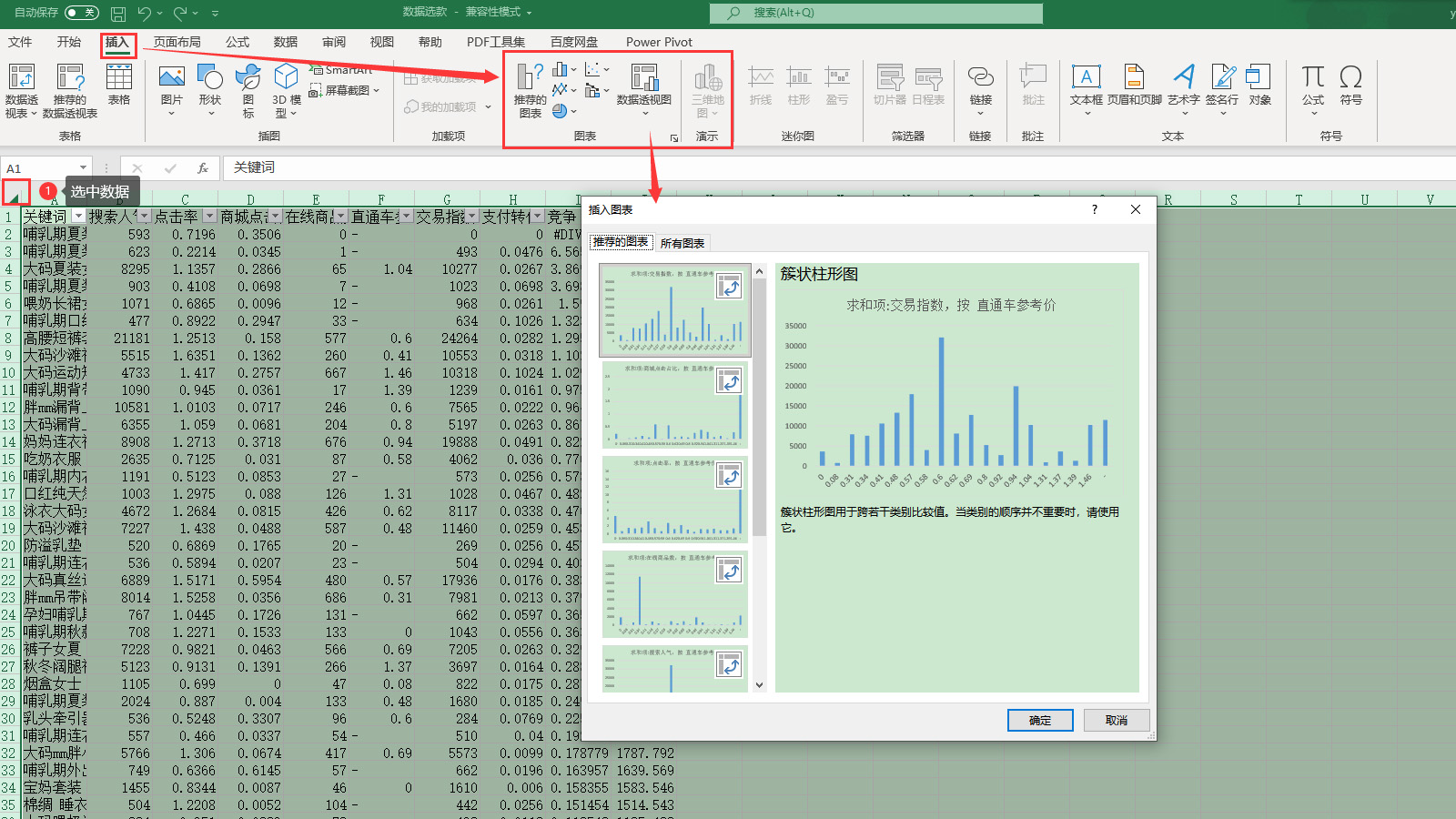将数据通过Microsoft 365的Excel打开,然后选中全部数据,单击顶部菜单栏“插入”,在工具栏找到“图表”区域,单击“推荐图表”,便可打开设置窗口(图2)。