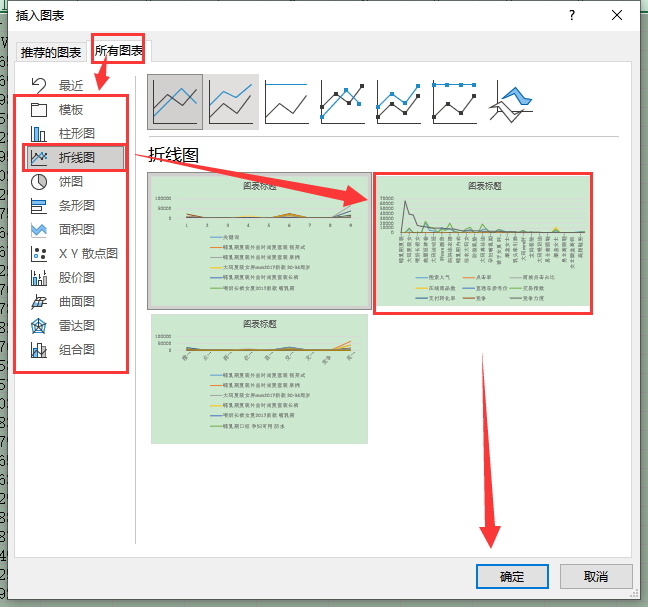修改其他图样的时候,在“图表设置框”内单击“所有图表”,根据图形样式,来选择即可。如图3,我们选择“拆线图”的一种,单击“确定”,便可将其插入图表中(如图4)。
