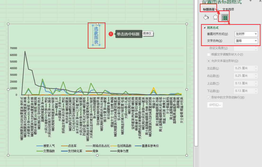 除设计文本样式外,还可以设置标题的对齐方式。单击选中标题,单击“标题选项”,在“大小与属性”设置区域,可以编辑文字的方向及垂直对齐方式(如图7)。