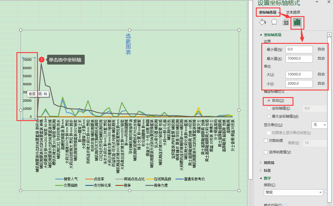 单击选中图标左侧坐标轴,于右侧“设置坐标轴格式”位置,便可编辑“坐标轴选项”。坐标轴选项默认为“自动”,即软件会根据数据自动建立相应的坐标轴数值。如需调整,直接双击输入框,编辑数值即可。