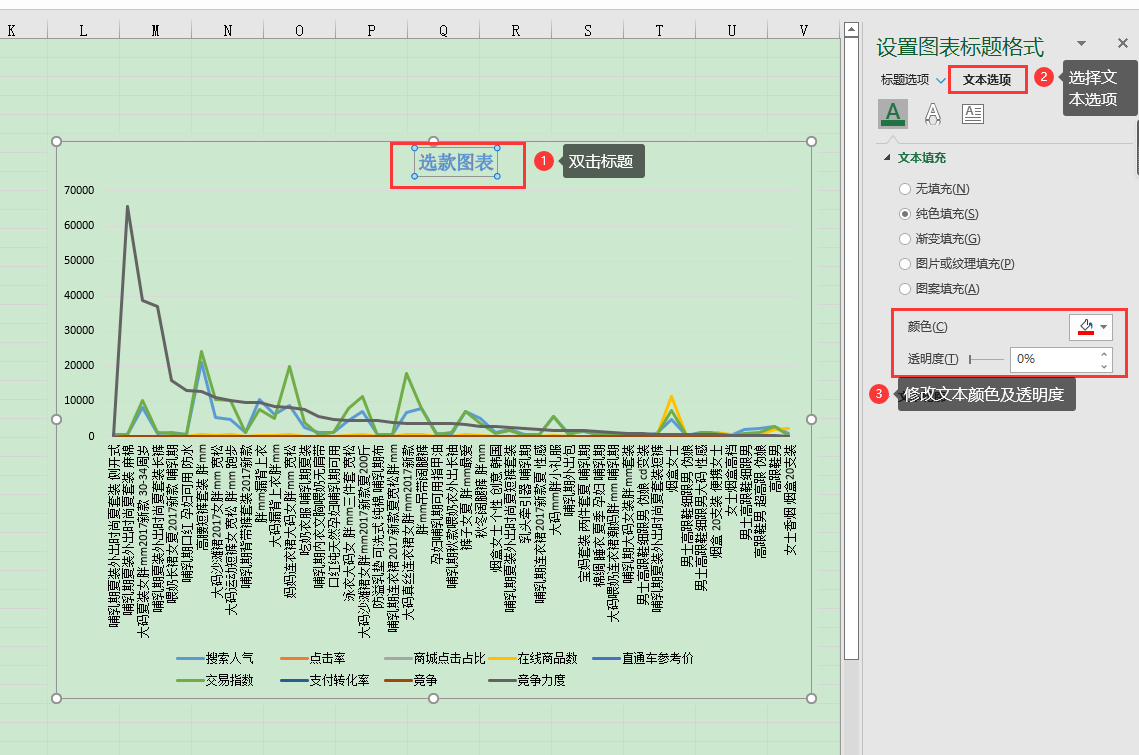 选中图标中的标题,直接输入文字即可,如选款图表。除了修改图表文字内容外,我们还可以修改标题的样式。双击标题,Excl右侧将出现“图表标题格式设置”区域,在此区域内,我们可以编辑标题的文本颜色、透明度等内容(如图6)。