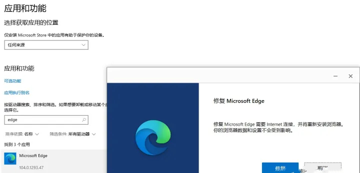 右击开始菜单-应用和功能-应用列表 下方搜索框-搜索 EDGE-修改-修复-系统将提示是否修复Microsoft Edge,修复Microsoft Edge需要Internet连接,并将重新安装浏览器,浏览器的数据和设置不会受到影响-确保电脑已联网并点击 修复-等待提示安装完成-关闭。