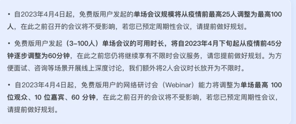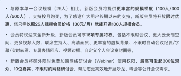 假如我们在4月3日之前已开通会员,那么会员剩余的有效期内,将自动升级为会议规模100人的会员,若是连续包月的用户,当月有效期也将自动免费升级为100人的会员,如果继续保持续订,后续可按照原价格续费。