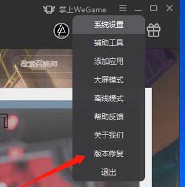 2、登录WeGame后我们点击右上角三条杠的设置选项吗,在选项栏中我们选择版本修复。