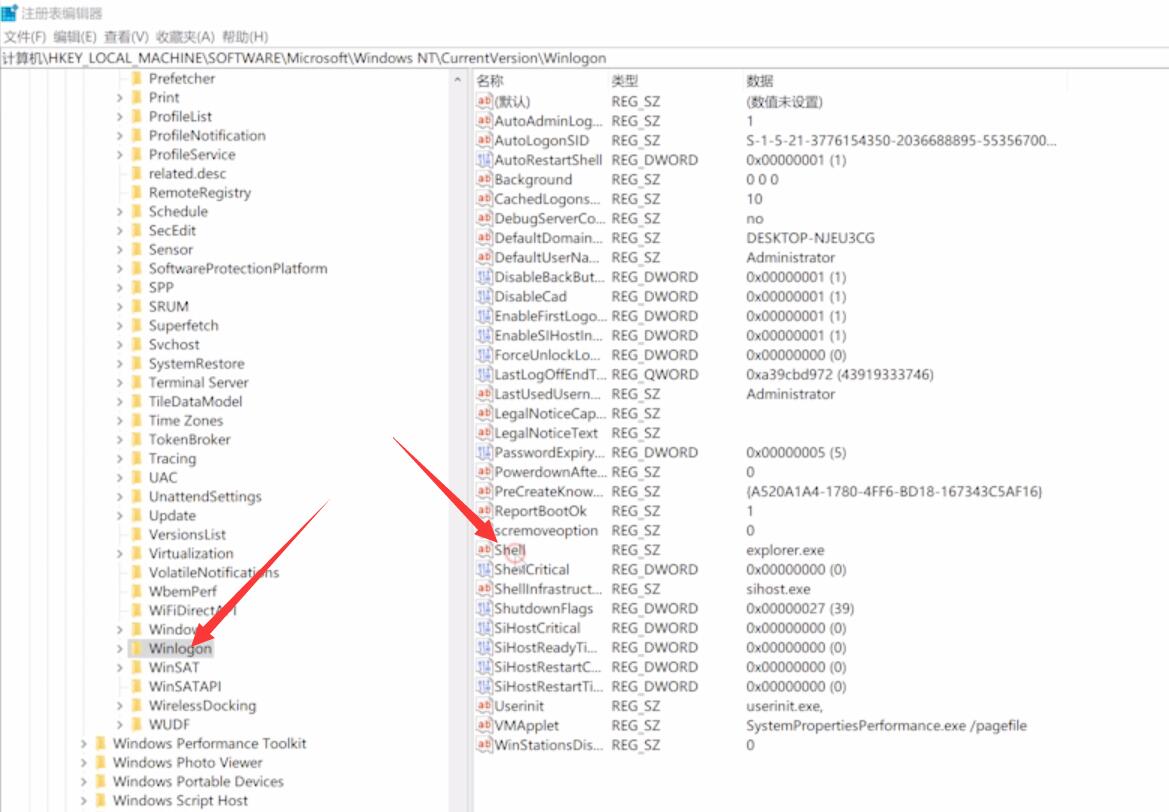 4、单击选中Winlogon,在右侧窗口中双击Shell,若Shell的数值数据为explorer.exe则正确,若不是,则更改为explorer.exe,点击确定即可(如图所示)。