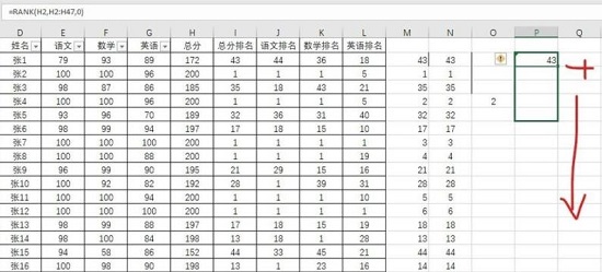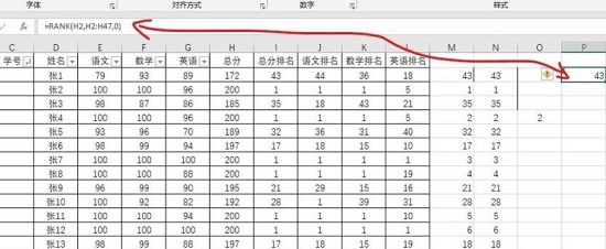 2、然后在单元格中输入公式:=RANK(H2,H2:H47,0)可以看到第一行43的排行。
