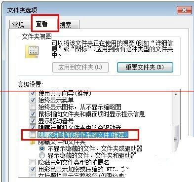 2、在弹出来的文件夹选项窗口中,切换到“查看”选项卡,然后在高级设置列表中选择将“隐藏受保护的操作系统文件(推荐)”前面的够勾去掉,并选择“显示所有文件和文件夹”,设置完成后点击确定按钮。