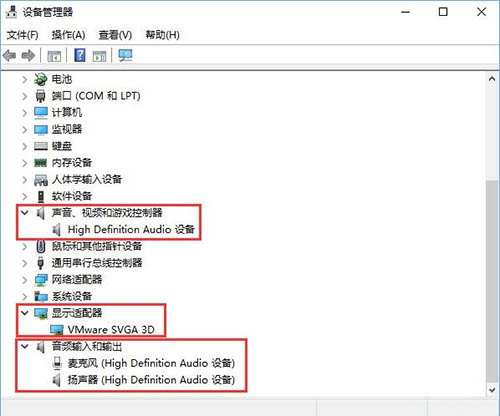 2、打开设备管理器分别展开【声音、视频和游戏控制器 】和【显示适配器】、【音频输入和输出】查看是否有 ↓ 的箭头,若有的话在对应设备上单击右键,选择【启用】;如图所示: