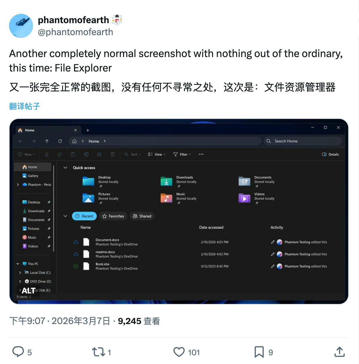 3 月 7 日,X 博主 Phantomofearth 发现,微软正在测试为文件资源管理器的地址栏和搜索栏加入圆角设计。