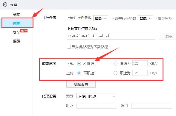3、然后我们就会来到一个新的页面,我们看到左侧的【传输】按钮,选择它,然后在看到右边的选项,找到【传输速度】按钮,把它修改为不限速就可以了。