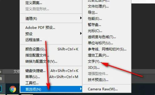 2、点击编辑后,点击首选项,然后选择文字。