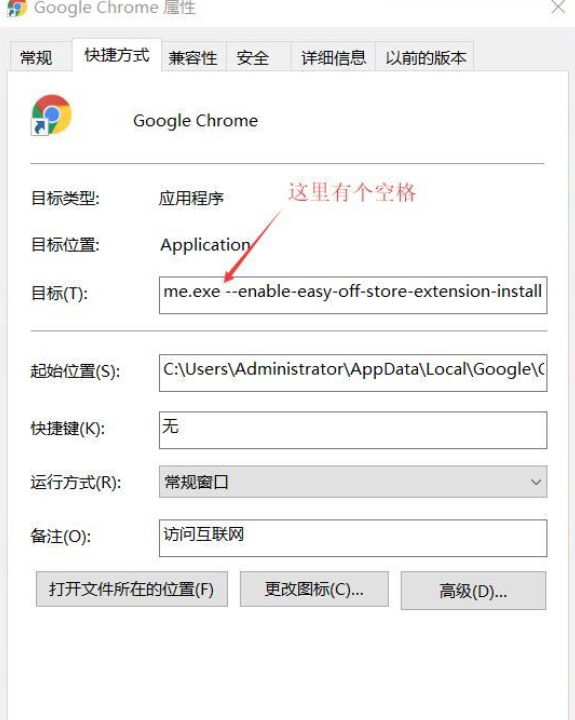 2、在目标(T)后添加参数 --enable-easy-off-store-extension-install (注意在添加参数之前,要有个空格),添加完之后点击确认。