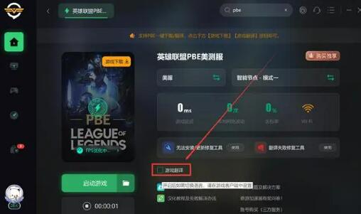 3、击游戏翻译功能后,再次打开英雄联盟PBE客户端,这样就可以成功汉化游戏。现在使用兑换码,即可在奇游中兑换免费加速时长。