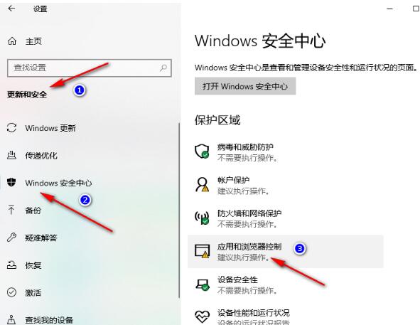 2、进入设置页面之后,点击“更新和安全”选项,再打开“Windows安全中心”选项,在安全中心页面中我们选择“应用和浏览器控制”选项。