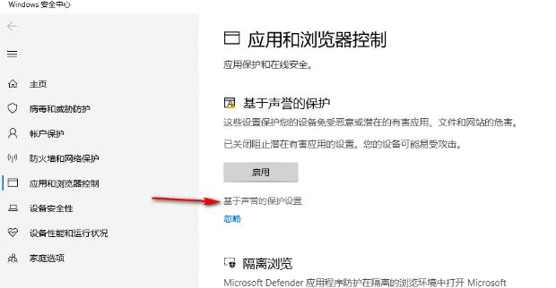 3、我们进入“应用和浏览器控制”页面之后,在该页面中点击“基于声誉的保护设置”选项。