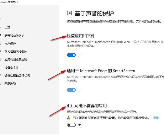 4、进入“基于声誉的保护”页面之后,我们在该页面中将所有的选项开关都点击关闭即可,需要注意的是,这两种方法都需要在下载完成文件之后及时恢复原本的设置,因为关闭了安全防护可能会让我们的电脑受到攻击。