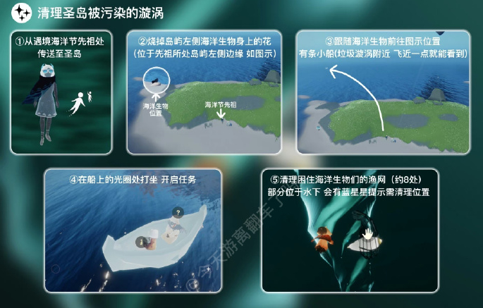 在圣岛漩涡,坐船接受清理任务。