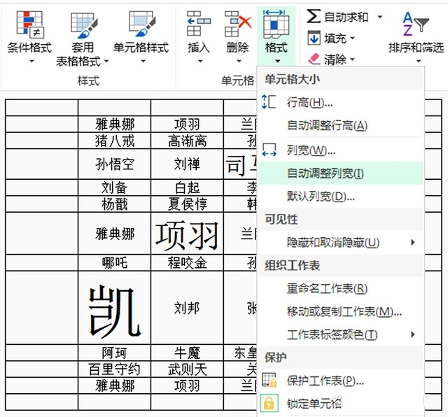 点击【开始】,继续点击【格式】,然后点击【自动调整列宽】,此时,列宽会根据内容长度,自动调整每一列的宽度,而“自动调整行高”,会根据文本字体大小,自动调整适应每一行的高度。