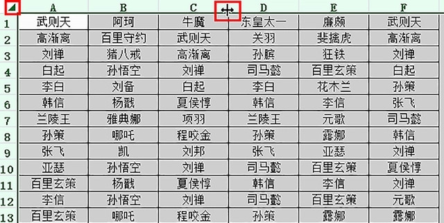 打开Excel表格,按【Ctrl+A】快捷键,选中全部表格(或者点击表格左上角,行号和列标交汇处的灰色小三角,也可以选中整个表格),鼠标移动到列标交界处(如列A与列B交界处)。