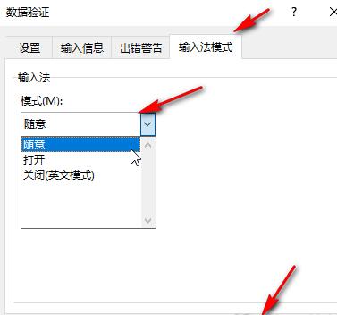 3、进入窗口后切换到“输入法模式”栏,点击“模式”处的下拉箭头选择“随意”,然后点击“确定”。