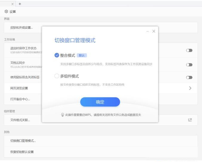 3、弹出【切换窗口管理模式】对话框,选择好后重启WPS完成切换。
