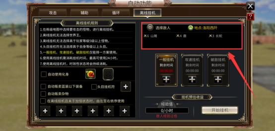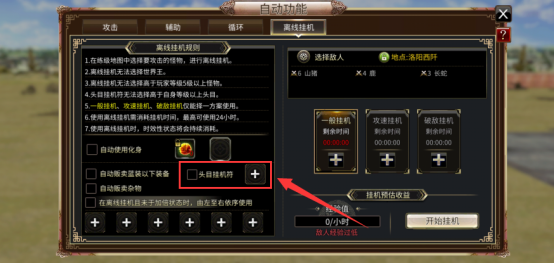 ③若角色撤退,或没有剩余时间、离开游戏时都将不开启自动离线挂机。