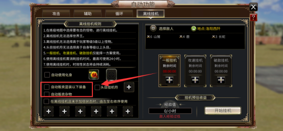 准备启动离线挂机时,可勾选下列项目自动贩卖。