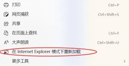 4、重启Edge浏览器,如果遇到需要使用IE浏览器兼容模式打开的网站,就点击Edge浏览器右上角的三个点图标,在弹出的菜单中选择【在Internet Explorer 模式下重新加载】。