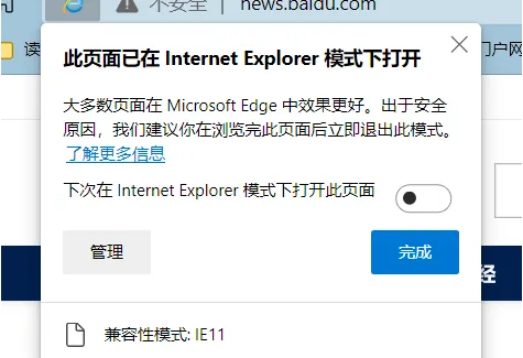 5、就可以打开该网站在Edge浏览器中已经在Internet Explorer 模式下打开。可以在弹出的界面中设置管理之后是否默认此模式开启该网站。