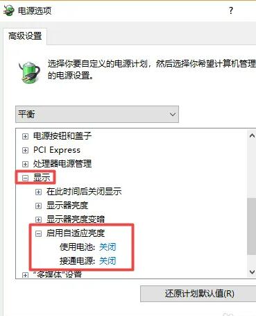 6、点开显示,将启用自适应亮度中的两个选择全部设置成关闭,点击应用,然后点击确定。