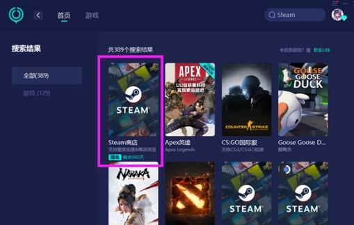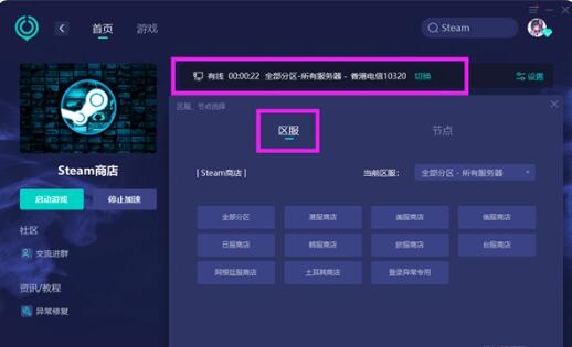 2、在搜索结果中,找到【Steam商店】进行加速,国内玩家可以直接加速,海外党们需要先在兑换窗口中输入口令码【Steam转区】领取加速时长后,才能进行加速。