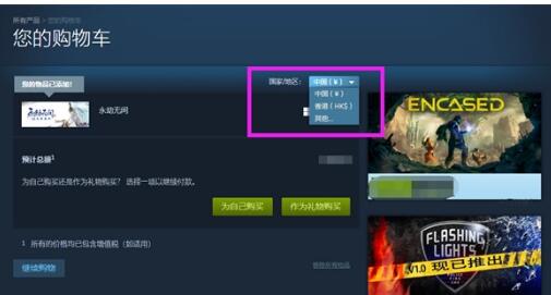 5、点击左上角进入Steam商店,随便选择一款游戏,将其加入购物车,在购物车中,可以看到地区选择,这时候就会出现刚刚进行加速的地区了。