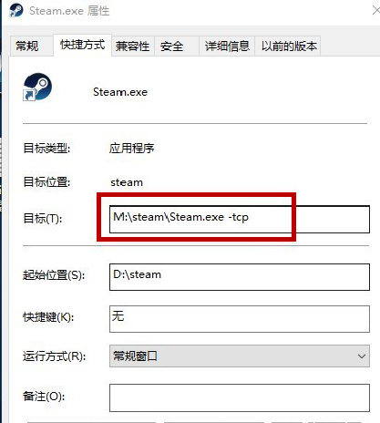 在“快捷方式”的页面的“目标”后辍增加 -tcp 如:M:\steam\Steam.exe 空格 -tcp,-tcp的前面加上一个空格就行。