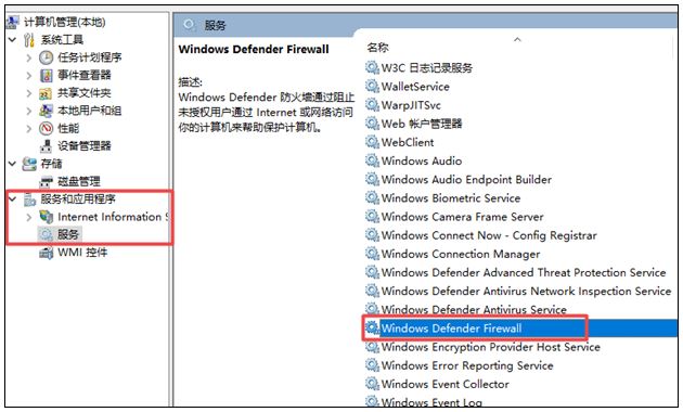 windows系统服务中的有一项名为windows firewall的服务(Windows10系统名为Windows Defender Firewall),如果此服务被关闭,将不能共享打印机。