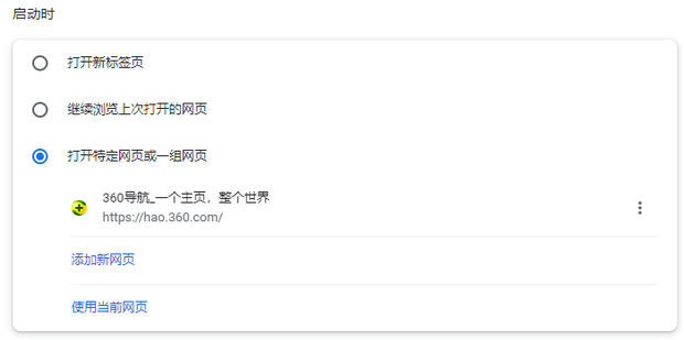 6、如图所示,这里【打开特定网页或一组网页】是360导航的网址。