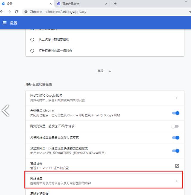 3、接着就会打开一个安全性的设置页面,找到【网站设置】选项,然后用鼠标点击进入。