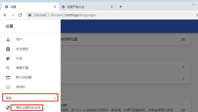 2、点击【高级】选项,之后就会展开一些菜单选项,选择【隐私设置和安全性】。