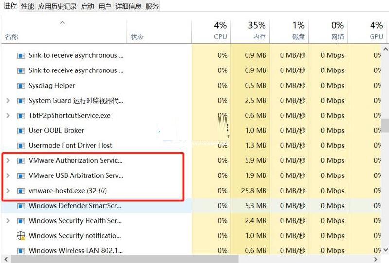 3、在windows中使用【Crtl+Shift+Esc】打开任务管理器,并找到以VM打头命名的进程,然后右键结束这些进程任务。