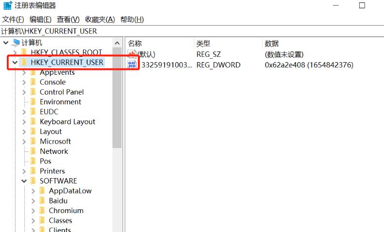 2、在【注册表编辑器】中找到【HKEY_CURRENT_USER】目录。