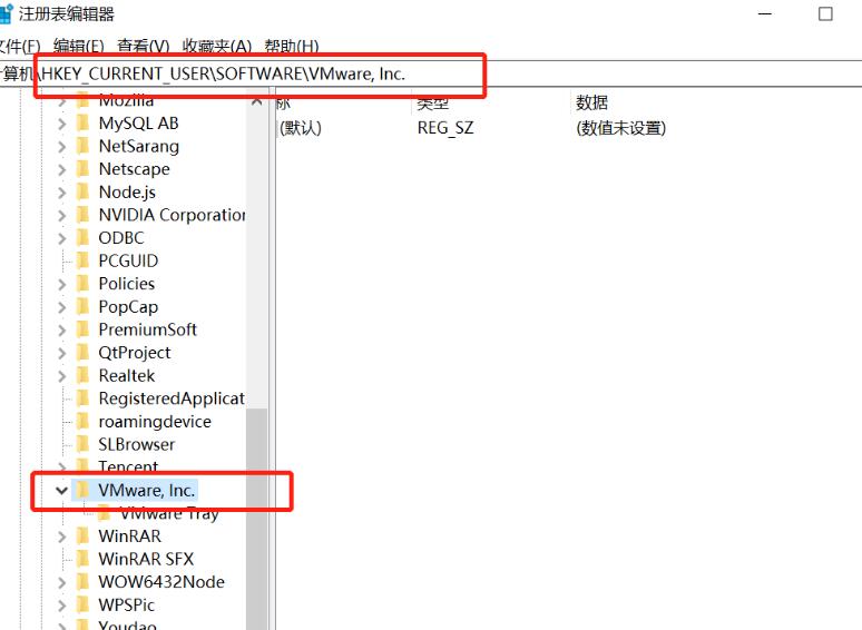 4、然后在【software】目录下找到【VMware,Inc】,然后选中右键删除。