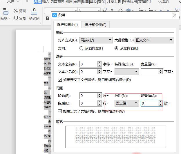 3、单击右键,在“段落”设置行距为“固定值”,数值为0。