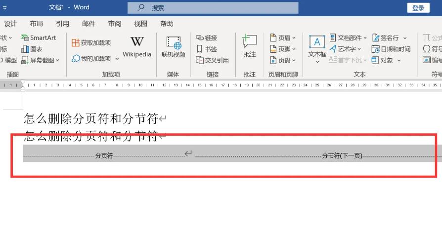 2、移动鼠标到分页符左侧变成白箭头符号后,点击左键,选中整个”分页符“和”分节符“。
