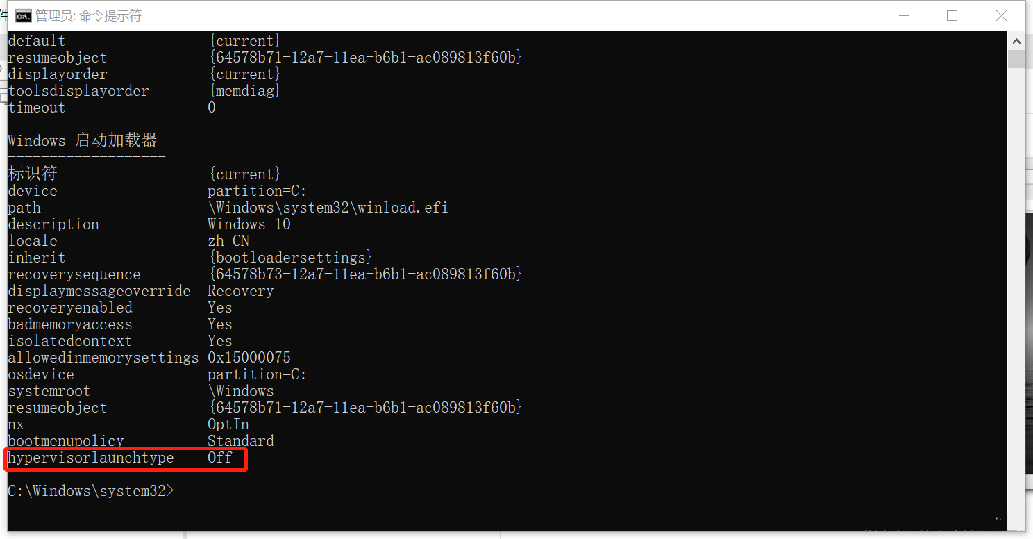 步骤1:用管理员身份启动cmd,输入:bcdedit 查看hyper-v的状态,这里应该是off关闭状态。