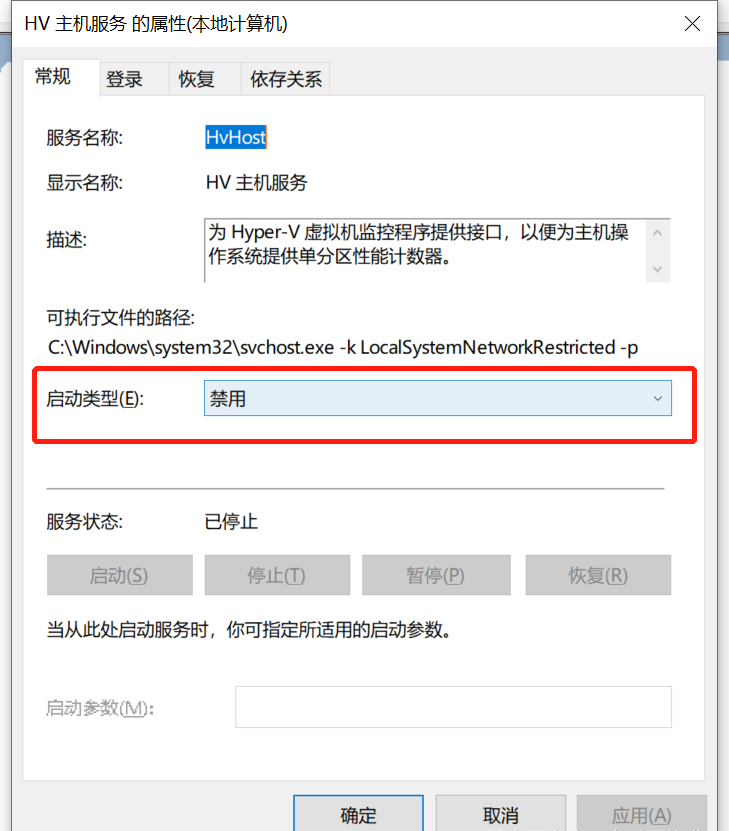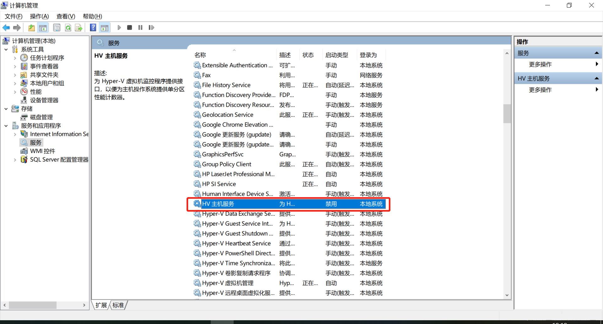 步骤3:右脚桌面我的电脑>管理>服务和应用程序>服务,找到HV主机服务, 右键属性,启动类型改为禁用。