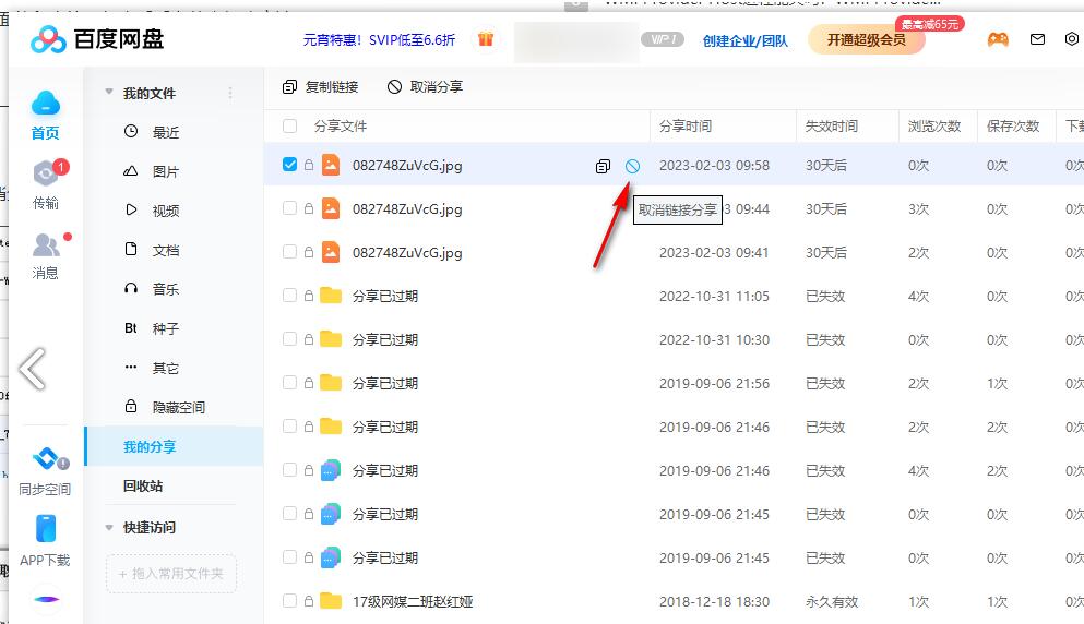 5、进入到页面之后,将鼠标放在自己刚刚分享的文件上,就会出现两个图标,点击【取消链接分享图标】。